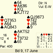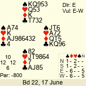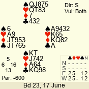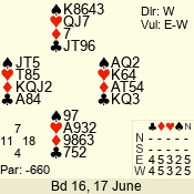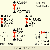 | Con | Dc | Res | Score | Ld | Pairs | Rd | Tbl | | 6 NT | W | -4 | 200 | J | 05 - 07 | 7 | 5 |