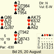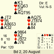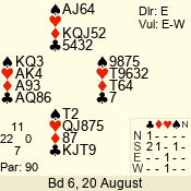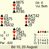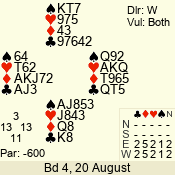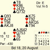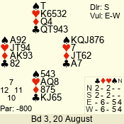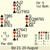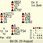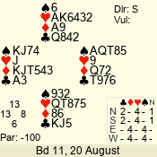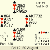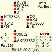| Con | Dc | Res | Score | Ld | Pairs | Rd | Tbl |  | 4  | S | = | 620 |  J | 01 - 11 | 6 | 3 |  | 3  | E | -1 | 100 |  4 | 05 - 12 | 7 | 2 |  |  |  |  | – |  | 09 - 03 | 4 | 5 |  | 4  | S | -1 | -100 |  7 | 10 - 08 | 8 | 1 |  | 5  | S | -2 | -200 |  J | 02 - 07 | 5 | 4 |  | 4  | S | -2 | -200 |  J | 04 - 06 | 3 | 6 |  | Datum:   40 (-80) |  |