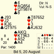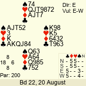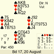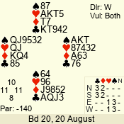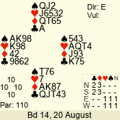 | Con | Dc | Res | Score | Ld | Pairs | Rd | Tbl |  | 5  x | E | -5 | 1100 |  Q | 08 - 11 | 4 | 3 |  | 4  | N | +1 | 450 |  4 | 10 - 06 | 6 | 1 |  | 4  | S | +1 | 450 |  3 | 02 - 04 | 1 | 6 |  | 2  | N | +2 | 170 |  2 | 07 - 01 | 2 | 5 |  |  |  |  | – |  | 03 - 12 | 5 | 2 |  | 4  | N | -1 | -50 |  3 | 09 - 05 | 3 | 4 |  | Datum:   350 (200) |  |