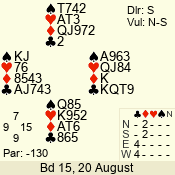| Con | Dc | Res | Score | Ld | Pairs | Rd | Tbl |  | 3  | E | -1 | 50 |  A | 10 - 05 | 5 | 1 |  |  |  |  | – |  | 01 - 03 | 9 | 6 |  | 2  | E | +1 | -110 |  6 | 02 - 12 | 4 | 2 |  | 3  | E | +1 | -130 |  A | 08 - 04 | 2 | 4 |  | 2  | E | +2 | -130 |  3 | 06 - 09 | 1 | 5 |  | 2  | E | +3 | -150 |  2 | 07 - 11 | 3 | 3 |  | Datum:   -80 |  |