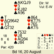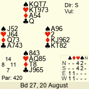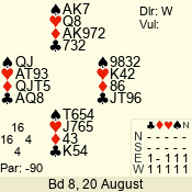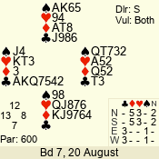 | Con | Dc | Res | Score | Ld | Pairs | Rd | Tbl |  | 3 NT | W | -2 | 100 |  K | 10 - 07 | 7 | 1 |  | 2 NT | W | -2 | 100 |  K | 04 - 12 | 6 | 2 |  | 3 NT | W | -2 | 100 |  K | 09 - 11 | 5 | 3 |  | 2 NT | W | -1 | 50 |  K | 08 - 02 | 3 | 5 |  |  |  |  | – |  | 03 - 05 | 2 | 6 |  | 3  | E | = | -140 |  4 | 01 - 06 | 4 | 4 |  | Datum:   40 (70) |  |