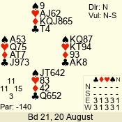 | Con | Dc | Res | Score | Ld | Pairs | Rd | Tbl |  | 3  | N | +2 | 200 |  A | 06 - 12 | 8 | 2 |  | 3  | N | +1 | 170 |  6 | 01 - 04 | 5 | 5 |  | 2  | N | +1 | 140 |  9 | 10 - 09 | 9 | 1 |  | 2  | N | +1 | 140 |  9 | 05 - 07 | 4 | 6 |  | 4  | E | -2 | 100 |  A | 02 - 11 | 7 | 3 |  |  |  |  | – |  | 03 - 08 | 6 | 4 |  | Datum:   130 (150) |  |
