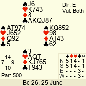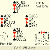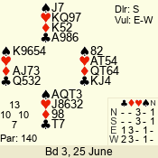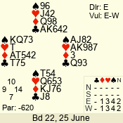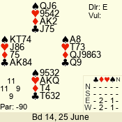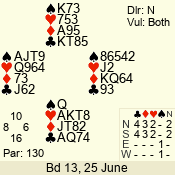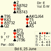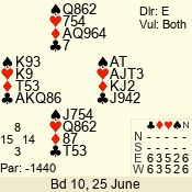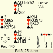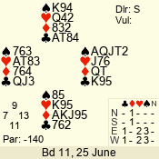 | Con | Dc | Res | Score | Ld | Pairs | Rd | Tbl | Sec | | 3 N | E | -1 | 100 | 4 | 06 - 04 | 2 | 6 | d |