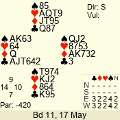 Con | Dc | Res | Score | Ld | Pairs | Rd | Tbl | 2 NT | S | = | 120 | 3 | 11 - 10 | 2 | 11 |