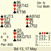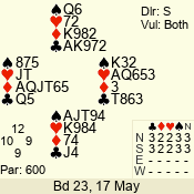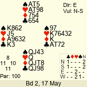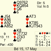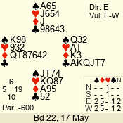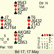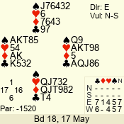 Con | Dc | Res | Score | Ld | Pairs | Rd | Tbl | 3 NT | E | -1 | 100 | 7 | 11 - 12 | 12 | 11 |