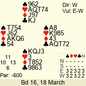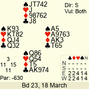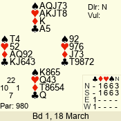 Con | Dc | Res | Score | Ld | Pairs | Rd | Tbl | 3 NT | N | +3 | 690 | 6 | 07 - 07 | 1 | 7 |