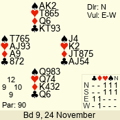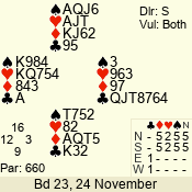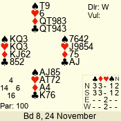 | Con | Dc | Res | Score | Ld | Pairs | Rd | Tbl | | 3 NT | W | -1 | 100 | K | 05 - 09 | 7 | 5 |