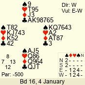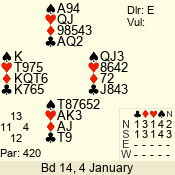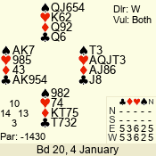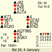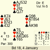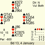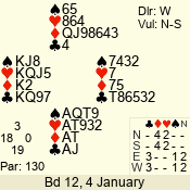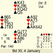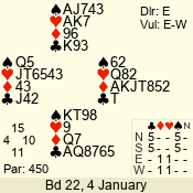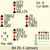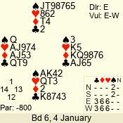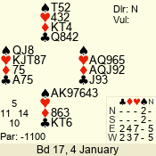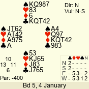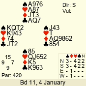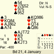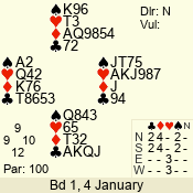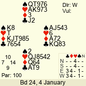 Con | Dc | Res | Score | Ld | Pairs | Rd | Tbl | 3 N | S | = | 400 | 4 | 24 - 11 | 14 | 24 |