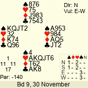 Con | Dc | Res | Score | Ld | Pairs | Rd | Tbl | 3  | W | = | -140 | Q | 01 - 04 | 6 | 1 |
