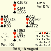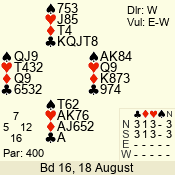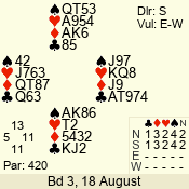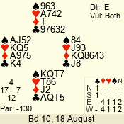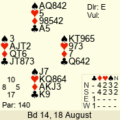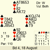| Con | Dc | Res | Score | Ld | Pairs | Rd | Tbl | | 3 N | N | +1 | 630 | 6 | 03 - 04 | 6 | 3 |