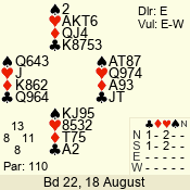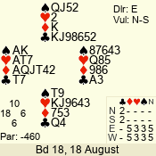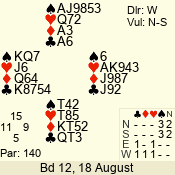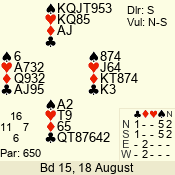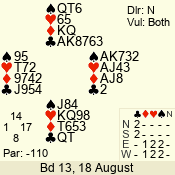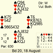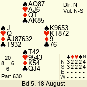 | Con | Dc | Res | Score | Ld | Pairs | Rd | Tbl | | 3 N | N | +1 | 630 | 6 | 05 - 06 | 6 | 5 |