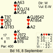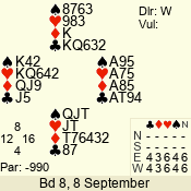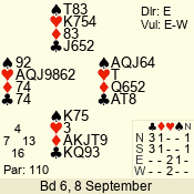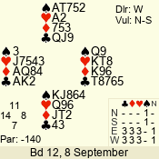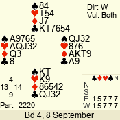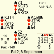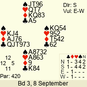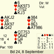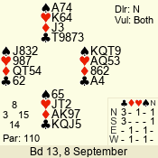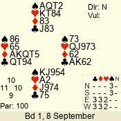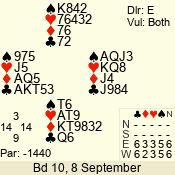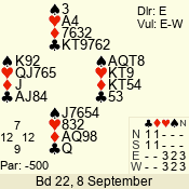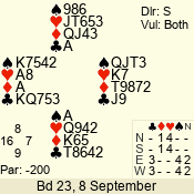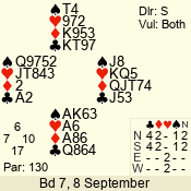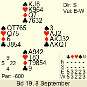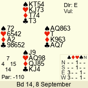 | Con | Dc | Res | Score | Ld | Pairs | Rd | Tbl | | 3 N | E | = | -600 | 2 | 07 - 08 | 8 | 7 |
