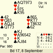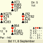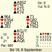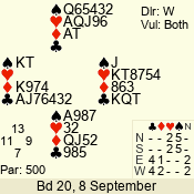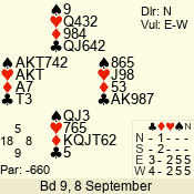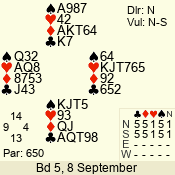 | Con | Dc | Res | Score | Ld | Pairs | Rd | Tbl | | 3 N | N | = | 600 | Q | 04 - 05 | 8 | 4 |
