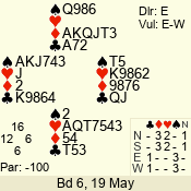 | Con | Dc | Res | Score | Ld | Pairs | Rd | Tbl | | 6 NT | S | +1 | 1020 | T | 02 - 03 | 9 | 2 |