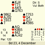 | Con | Dc | Res | Score | Ld | Pairs | Rd | Tbl | | 2 N | E | = | -120 | 2 | 10 - 02 | 4 | 3 |
