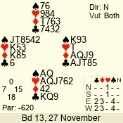 | Con | Dc | Res | Score | Ld | Pairs | Rd | Tbl | | 3 NT | N | +1 | 630 | Q | 09 - 09 | 1 | 9 |