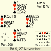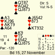 | Con | Dc | Res | Score | Ld | Pairs | Rd | Tbl | | 1 NT | W | -2 | 200 | 3 | 03 - 04 | 9 | 3 |
