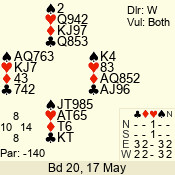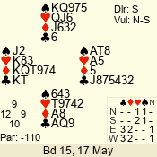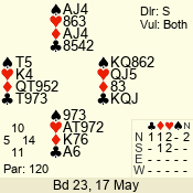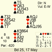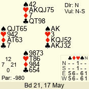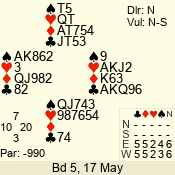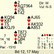 | Con | Dc | Res | Score | Ld | Pairs | Rd | Tbl | | 2 N | S | +2 | 180 | 2 | 07 - 02 | 5 | 1 |