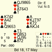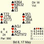 | Con | Dc | Res | Score | Ld | Pairs | Rd | Tbl | | 6 N | S | = | 990 | 6 | 06 - 03 | 2 | 2 |