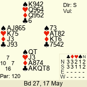 | Con | Dc | Res | Score | Ld | Pairs | Rd | Tbl | | 2 N | S | = | 120 | 5 | 03 - 07 | 1 | 1 |