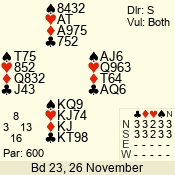Con | Dc | Res | Score | Ld | Pairs | Rd | Tbl | 3 NT | S | = | 600 | 3 | 04 - 03 | 2 | 4 |