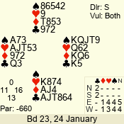 | Con | Dc | Res | Score | Ld | Pairs | Rd | Tbl | | 4 N | N | +1 | 660 | 7 | 04 - 05 | 5 | 4 |
