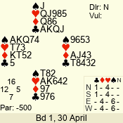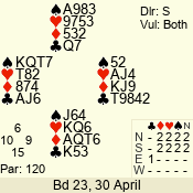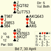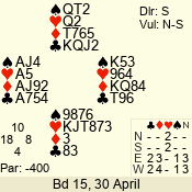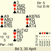 | Con | Dc | Res | Score | Ld | Pairs | Rd | Tbl |  | 3  | E | -2 | 200 |  7 | 05 - 01 | 3 | 5 |  | 3  | E | -1 | 100 |  8 | 14 - 13 | 13 | 1 |  |  |  |  | – |  | 07 - 10 | 11 | 3 |  | 2  | E | +1 | -110 |  7 | 11 - 03 | 10 | 4 |  | 4  | S | -2 | -200 |  J | 02 - 04 | 12 | 2 |  | 3  x | N | -2 | -500 |  A | 06 - 12 | 2 | 6 |  | 4  x | S | -2 | -500 |  J | 08 - 09 | 1 | 7 |  | Datum:   -140 |  |
