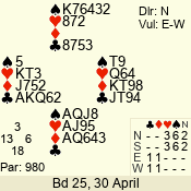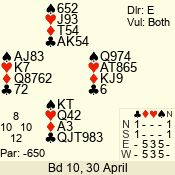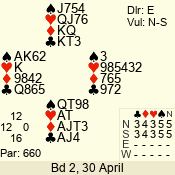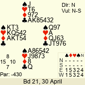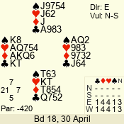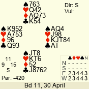 | Con | Dc | Res | Score | Ld | Pairs | Rd | Tbl |  | 3 NT | N | +2 | 660 |  4 | 14 - 02 | 2 | 1 |  | 3 NT | N | +1 | 630 |  5 | 09 - 12 | 13 | 3 |  | 3 NT | N | +1 | 630 |  5 | 08 - 01 | 4 | 6 |  | 3 NT | N | = | 600 |  5 | 13 - 05 | 12 | 4 |  | 2 NT | N | +3 | 210 |  6 | 10 - 11 | 3 | 7 |  | 2 NT | N | +2 | 180 |  T | 04 - 06 | 1 | 2 |  |  |  |  | – |  | 07 - 03 | 5 | 5 |  | Datum:   420 |  |
