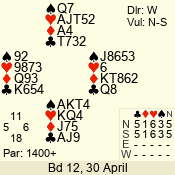 | Con | Dc | Res | Score | Ld | Pairs | Rd | Tbl |  |  |  |  | – |  | 07 - 08 | 13 | 7 |  | 3  | W | +2 | -200 |  3 | 04 - 13 | 2 | 5 |  | 4  | W | = | -420 |  A | 06 - 09 | 10 | 3 |  | 4  | W | = | -420 |  3 | 10 - 02 | 9 | 4 |  | 4  | W | = | -420 |  A | 05 - 11 | 1 | 6 |  | 4  | W | +1 | -450 |  2 | 14 - 12 | 12 | 1 |  | 4  | W | +1 | -450 |  | 01 - 03 | 11 | 2 |  | Datum:   -340 (-390) |  |