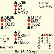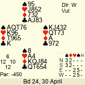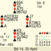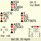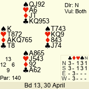 | Con | Dc | Res | Score | Ld | Pairs | Rd | Tbl |  | 3  | N | = | 140 |  A | 08 - 11 | 12 | 3 |  | 3  | N | = | 140 |  A | 12 - 04 | 11 | 4 |  | 2  | E | -1 | 50 |  5 | 06 - 02 | 4 | 5 |  | 3  | E | -1 | 50 |  7 | 09 - 10 | 2 | 7 |  |  |  |  | – |  | 07 - 13 | 3 | 6 |  | 3  | N | -1 | -50 |  A | 14 - 01 | 1 | 1 |  | 3  | E | = | -140 |  7 | 03 - 05 | 13 | 2 |  | Datum:   30 |  |