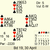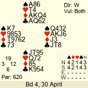 | Con | Dc | Res | Score | Ld | Pairs | Rd | Tbl |  | 4  | S | = | 620 |  J | 08 - 13 | 7 | 4 |  | 3 NT | N | = | 600 |  K | 05 - 06 | 11 | 7 |  | 4  | W | -4 | 400 |  | 02 - 11 | 13 | 5 |  |  |  |  | – |  | 04 - 07 | 8 | 3 |  | 3 NT | N | -1 | -100 |  6 | 03 - 09 | 12 | 6 |  | 3 NT | N | -1 | -100 |  K | 14 - 10 | 10 | 1 |  | 2  | S | -1 | -100 |  K | 12 - 01 | 9 | 2 |  | Datum:   190 |  |