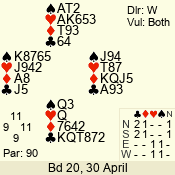 | Con | Dc | Res | Score | Ld | Pairs | Rd | Tbl |  | 3 NT | N | +3 | 690 |  7 | 14 - 11 | 11 | 1 |  | 4  | N | +1 | 650 |  Q | 05 - 08 | 9 | 3 |  | 3 NT | N | +1 | 630 |  Q | 09 - 01 | 8 | 4 |  | 3 NT | N | = | 600 |  Q | 13 - 02 | 10 | 2 |  | 3 NT | N | = | 600 |  Q | 03 - 12 | 1 | 5 |  | 3  | N | = | 140 |  Q | 04 - 10 | 13 | 6 |  |  |  |  | – |  | 06 - 07 | 12 | 7 |  | Datum:   470 |  |