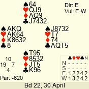 | Con | Dc | Res | Score | Ld | Pairs | Rd | Tbl |  | 3  | S | = | 140 |  3 | 10 - 03 | 6 | 6 |  | 3  | S | = | 140 |  K | 12 - 13 | 5 | 7 |  | 5  | E | -2 | 100 |  K | 06 - 08 | 3 | 2 |  |  |  |  | – |  | 02 - 07 | 1 | 4 |  | 2  | S | -1 | -50 |  6 | 09 - 05 | 7 | 5 |  | 3  | S | -1 | -50 |  6 | 14 - 04 | 4 | 1 |  | 4  | S | -2 | -100 |  7 | 11 - 01 | 2 | 3 |  | Datum:   30 |  |