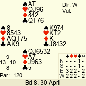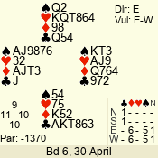 | Con | Dc | Res | Score | Ld | Pairs | Rd | Tbl |  |  |  |  | – |  | 06 - 07 | 12 | 7 |  | 2  | W | +2 | -130 |  7 | 13 - 02 | 10 | 2 |  | 2  | W | +4 | -170 |  7 | 05 - 08 | 9 | 3 |  | 3 NT | E | +1 | -630 |  8 | 14 - 11 | 11 | 1 |  | 3 NT | E | +1 | -630 |  5 | 09 - 01 | 8 | 4 |  | 3 NT | E | +2 | -660 |  5 | 03 - 12 | 1 | 5 |  | 3 NT | E | +4 | -720 |  5 | 04 - 10 | 13 | 6 |  | Datum:   -420 |  |