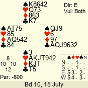 | Con | Dc | Res | Score | Ld | Pairs | Rd | Tbl | | 3 NT | N | = | 600 | 4 | 07 - 02 | 6 | 7 |