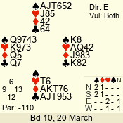 | Con | Dc | Res | Score | Ld | Pairs | Rd | Tbl | | 6 NT | E | -1 | 100 | Q | 05 - 01 | 5 | 5 |