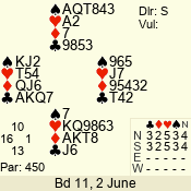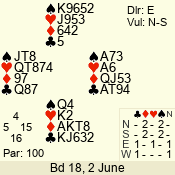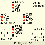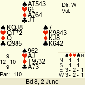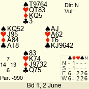 | Con | Dc | Res | Score | Ld | Pairs | Rd | Tbl |  | 4  | W | -1 | 100 |  4 | 01 - 01 | 11 | 1 |  |  |  |  | – |  | 06 - 02 | 5 | 6 |  | 2  | S | -1 | -50 |  3 | 08 - 06 | 3 | 8 |  | 1 NT | E | +1 | -120 |  Q | 10 - 10 | 1 | 10 |  | 2  | W | +1 | -140 |  J | 04 - 07 | 8 | 4 |  | 4  | S | -3 | -150 |  3 | 05 - 09 | 7 | 5 |  | 3  | W | +1 | -170 |  9 | 03 - 05 | 9 | 3 |  | 3  | W | +1 | -170 |  J | 07 - 04 | 4 | 7 |  | 3  | W | +1 | -170 |  J | 09 - 08 | 2 | 9 |  | 3  | W | +2 | -200 |  J | 02 - 03 | 10 | 2 |  | Datum:   -110 (-130) |  |
