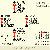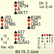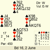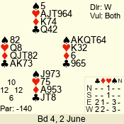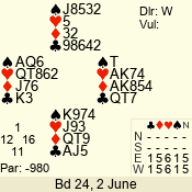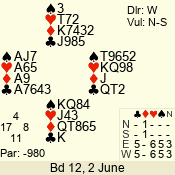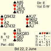 | Con | Dc | Res | Score | Ld | Pairs | Rd | Tbl |  | 4  | W | -1 | 50 |  7 | 03 - 07 | 7 | 3 |  | 4  | E | -1 | 50 |  Q | 07 - 06 | 2 | 7 |  |  |  |  | – |  | 06 - 04 | 3 | 6 |  | 4  x | N | -1 | -100 |  6 | 01 - 03 | 9 | 1 |  | 2  | W | +2 | -170 |  4 | 10 - 10 | 11 | 10 |  | 2  | W | +2 | -170 |  A | 04 - 09 | 6 | 4 |  | 3  | W | +2 | -200 |  A | 09 - 02 | 12 | 9 |  | 4  | E | = | -420 |  3 | 02 - 05 | 8 | 2 |  | 4  | W | +1 | -450 |  A | 05 - 01 | 5 | 5 |  | 4  | W | +1 | -450 |  2 | 08 - 08 | 1 | 8 |  | Datum:   -190 |  |