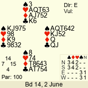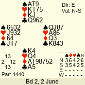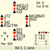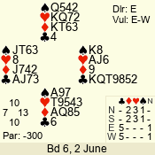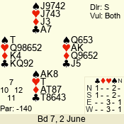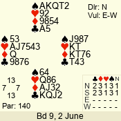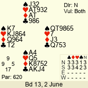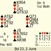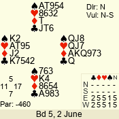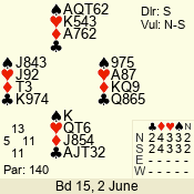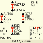 | Con | Dc | Res | Score | Ld | Pairs | Rd | Tbl |  | 4  | S | = | 420 |  3 | 10 - 06 | 5 | 10 |  | 3  | S | +1 | 170 |  3 | 05 - 05 | 11 | 5 |  | 2  | S | +1 | 140 |  A | 07 - 10 | 8 | 7 |  |  |  |  | – |  | 06 - 08 | 9 | 6 |  | 4  | E | = | -130 |  T | 01 - 09 | 3 | 1 |  | 3  | E | +2 | -150 |  3 | 02 - 01 | 2 | 2 |  | 5  | E | = | -600 |  A | 09 - 04 | 6 | 9 |  | 5  | E | = | -600 |  A | 03 - 03 | 1 | 3 |  | 5  x | E | = | -750 |  A | 04 - 07 | 12 | 4 |  | 5  x | E | = | -750 |  A | 08 - 02 | 7 | 8 |  | Datum:   -230 |  |
