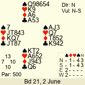 | Con | Dc | Res | Score | Ld | Pairs | Rd | Tbl |  | 2  | E | -4 | 200 |  Q | 07 - 06 | 2 | 7 |  | 2  | N | = | 110 |  A | 01 - 03 | 9 | 1 |  | 2  | W | -2 | 100 |  5 | 05 - 01 | 5 | 5 |  | 1 NT | S | = | 90 |  8 | 02 - 05 | 8 | 2 |  |  |  |  | – |  | 06 - 04 | 3 | 6 |  | 1 NT | E | = | -90 |  A | 09 - 02 | 12 | 9 |  | 1 NT | E | = | -90 |  Q | 03 - 07 | 7 | 3 |  | 2 NT | S | -1 | -100 |  8 | 10 - 10 | 11 | 10 |  | 3  | N | -1 | -100 |  A | 04 - 09 | 6 | 4 |  | 3  | W | = | -140 |  2 | 08 - 08 | 1 | 8 |  | Datum:   0 |  |