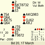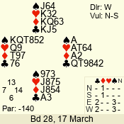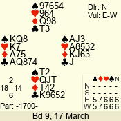 | Con | Dc | Res | Score | Ld | Pairs | Rd | Tbl | | 3 N | N | +3 | 690 | 6 | 02 - 03 | 7 | 2 |
