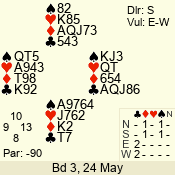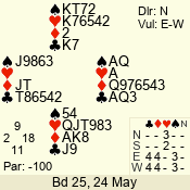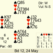 | Con | Dc | Res | Score | Ld | Pairs | Rd | Tbl | | 3 NT | W | -2 | 200 | 4 | 05 - 07 | 4 | 6 |