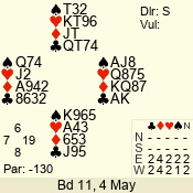 | Con | Dc | Res | Score | Ld | Pairs | Rd | Tbl | | 1 NT | S | +2 | 150 | 8 | 07 - 02 | 3 | 3 |
