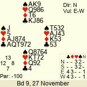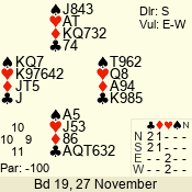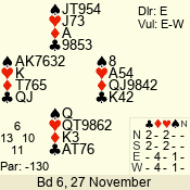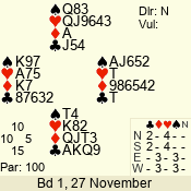 | Con | Dc | Res | Score | Ld | Pairs | Rd | Tbl | | 3 N | E | -1 | 100 | 2 | 06 - 02 | 5 | 6 |