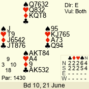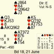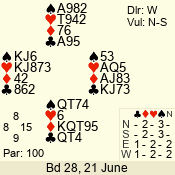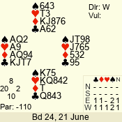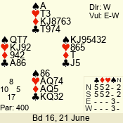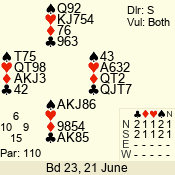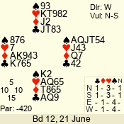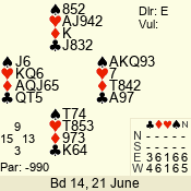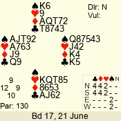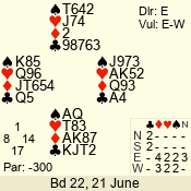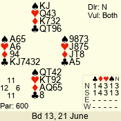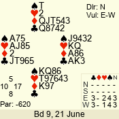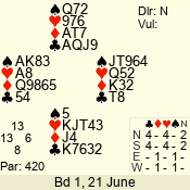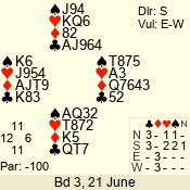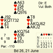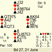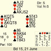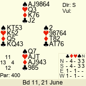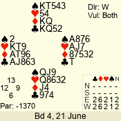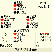| Con | Dc | Res | Score | Ld | Pairs | Rd | Tbl | | 3 N | N | +1 | 630 | 2 | 04 - 06 | 6 | 4 |