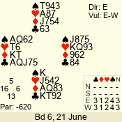 | Con | Dc | Res | Score | Ld | Pairs | Rd | Tbl | 4  | S | = | 620 | 2 | 04 - 02 | 3 | 4 |