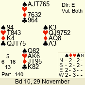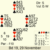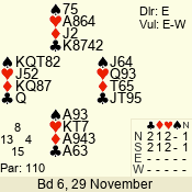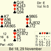 | Con | Dc | Res | Score | Ld | Pairs | Rd | Tbl | | 3 N | E | -4 | 400 | K | 05 - 06 | 6 | 5 |