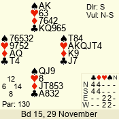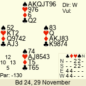 | Con | Dc | Res | Score | Ld | Pairs | Rd | Tbl | | 3 N | W | -1 | 50 | 2 | 05 - 03 | 3 | 5 |