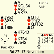 | Con | Dc | Res | Score | Ld | Pairs | Rd | Tbl | | 3 NT | N | +1 | 430 | Q | 09 - 09 | 1 | 9 |