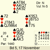 | Con | Dc | Res | Score | Ld | Pairs | Rd | Tbl | | 6 NT | S | = | 1440 | 9 | 05 - 08 | 7 | 5 |